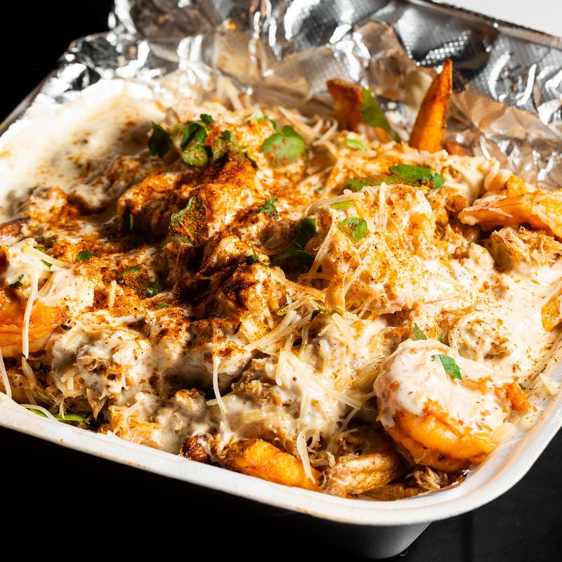 Hand cut fries, crispy fried chicken, sautéed shrimp, house alfredo sauce, parmesan cheese
