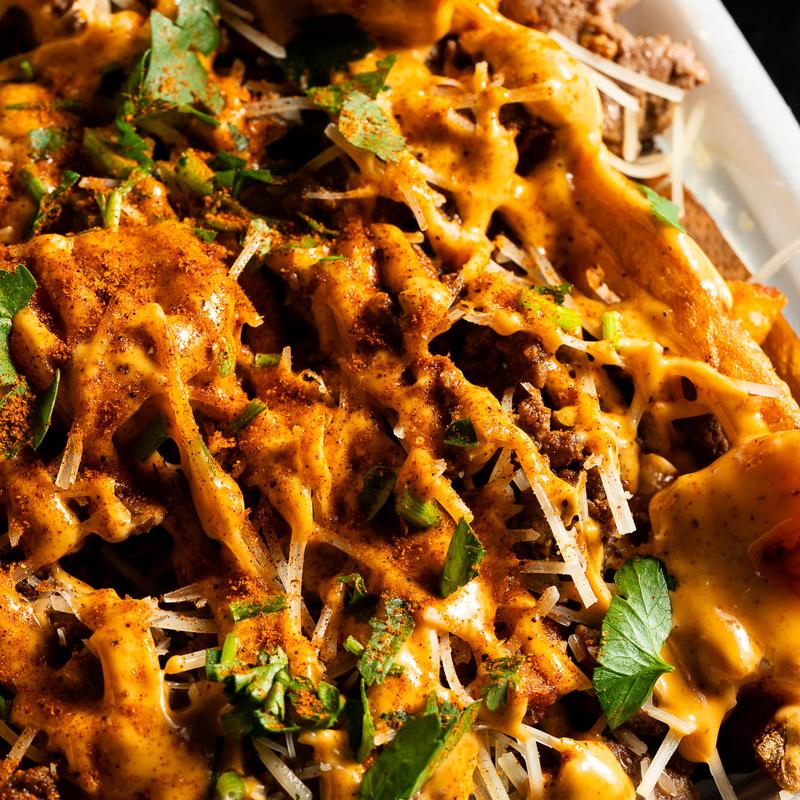 Hand cut fries, crispy chicken, house garlic buffalo, cajun ranch, cheese blend and bacon