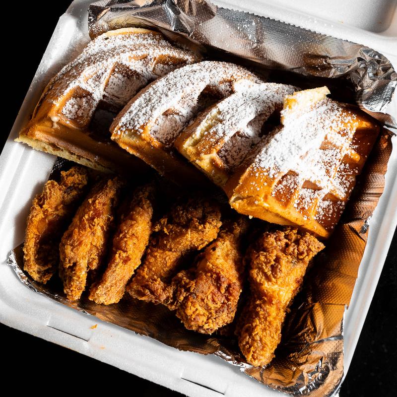 Hand breaded bone-in wings with our house made buttermilk waffle with sauce of your choice
