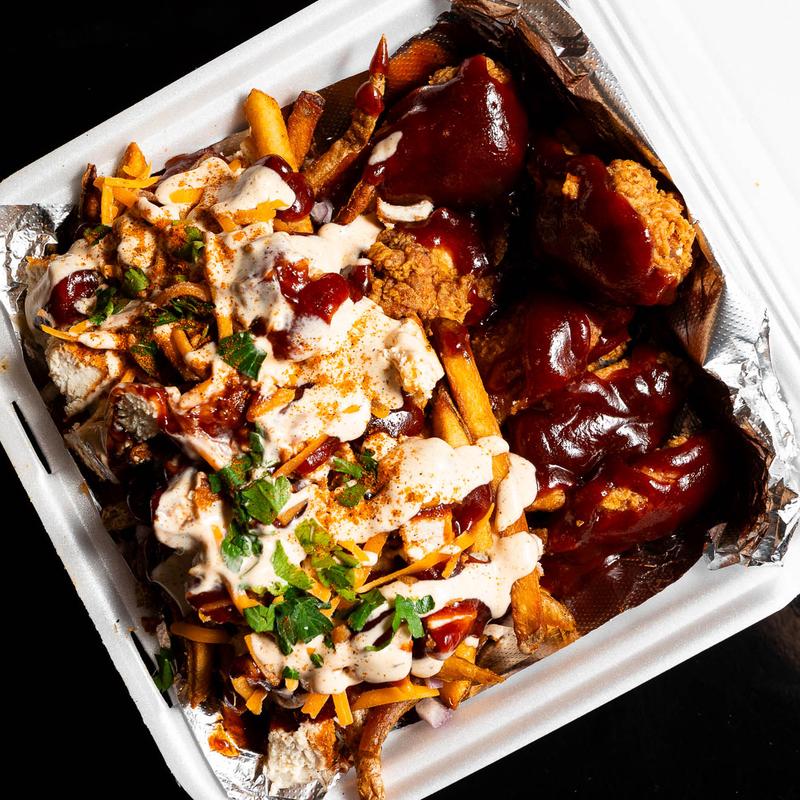 Hand cut fries, crispy chicken, cheese blend, bbq sauce, bacon, ranch, and red onions