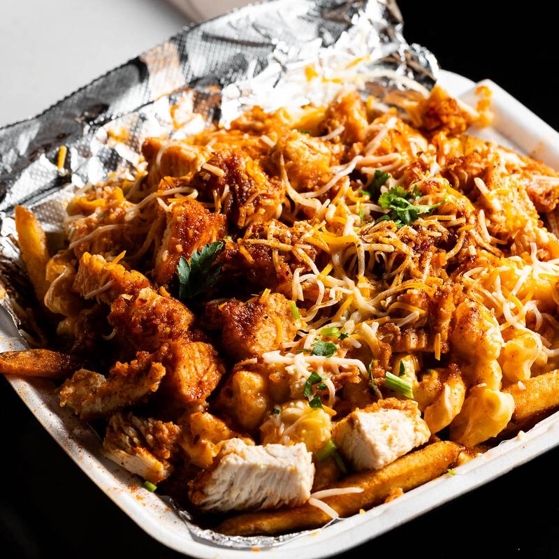 Our house hand cut fries tossed in our cajun seasoning blend, topped with our cheese blend, 5 cheese mac, crispy fried chicken breast, and topped with our house signature honey hot sauce, serves about 10