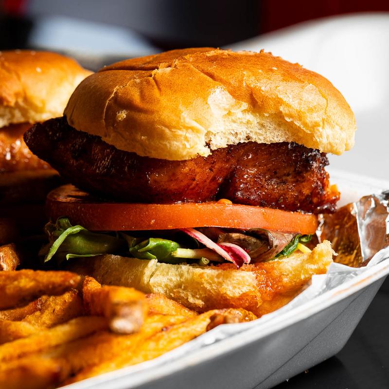 Seasoned & grilled mushroom cap, lettuce, tomato, pickles, onions, vegan mayo, brioche bun. Served with Cajun fries.